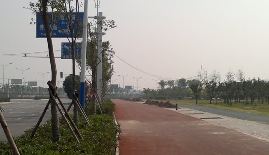 這條景觀路全長1.3公里,單獨紅色和綠色瀝青混凝土面層投資約200萬元。2013年9月下旬開始施工,目前已經(jīng)施工完畢。