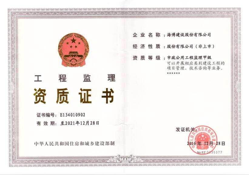 2016年12月28日,正值元旦佳節之際,我公司申報的“市政公用工程監理甲級資質”獲批,至此,我公司已擁有市政公用工程施工總承包壹級、水利水電工程監理甲級、市政公用工程監理甲級三項國家級資質。