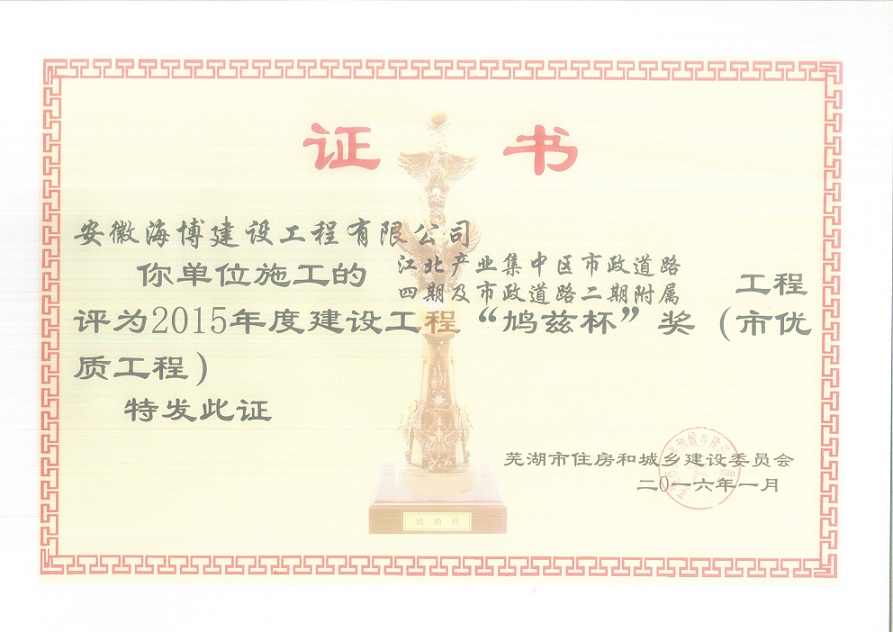 近期,我公司承建的江北產(chǎn)業(yè)集中區(qū)市政道路四期及市政道路二期附屬皖江大道明渠工程,喜獲2015-2016年度安徽省建設(shè)工程“黃山杯”榮譽(yù)。該工程位于蕪湖市鳩江區(qū)江北產(chǎn)業(yè)集中區(qū)起步區(qū)內(nèi),路線全長(zhǎng)約9.4km,呈“井”字形布局,路面寬度24~32m,設(shè)計(jì)車(chē)速40km/h,新建瀝青混凝土路面,工程總造價(jià)約1.47億元。2014年3月,榮獲江北產(chǎn)業(yè)集中區(qū)“安全生產(chǎn)工作先進(jìn)單位”稱(chēng)號(hào)。2016年1月,獲得2015年度蕪湖市建設(shè)工程“鳩茲杯”獎(jiǎng),全面實(shí)現(xiàn)了工程質(zhì)量目標(biāo)。
