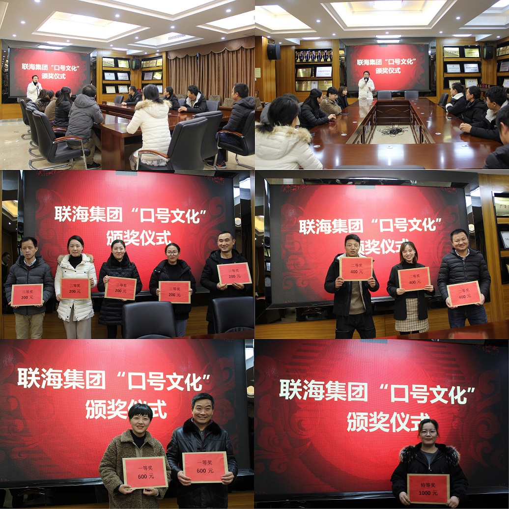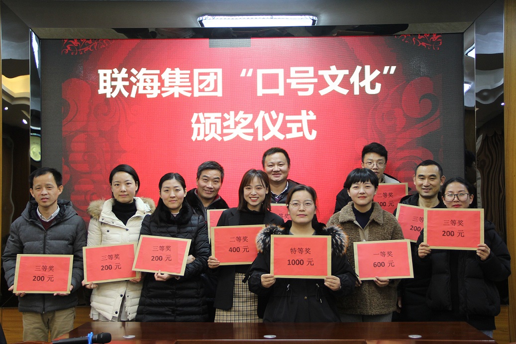 近期,集團(tuán)公司開展了《關(guān)于聯(lián)海集團(tuán)“口號(hào)文化”征集大賽的通知》活動(dòng),經(jīng)過兩次征選、全員投票的方式,評(píng)比出特等獎(jiǎng)、一等獎(jiǎng)、二等獎(jiǎng)、三等獎(jiǎng)共計(jì)11條獲獎(jiǎng)口號(hào)。并于2019年12月25日下午17:00由發(fā)展戰(zhàn)略執(zhí)行中心組織了頒獎(jiǎng)儀式,對(duì)獲獎(jiǎng)口號(hào)的部門給予表彰和現(xiàn)金獎(jiǎng)勵(lì)。